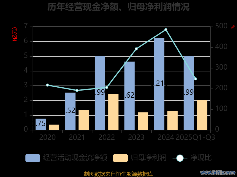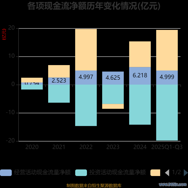 2025年前三季度,公司经营活动现金流净额为5亿元,同比增长66.43%;筹资活动现金流净额14.4亿元,同比增加8.54亿元;投资活动现金流净额-19.83亿元,上年同期为-9.55亿元。