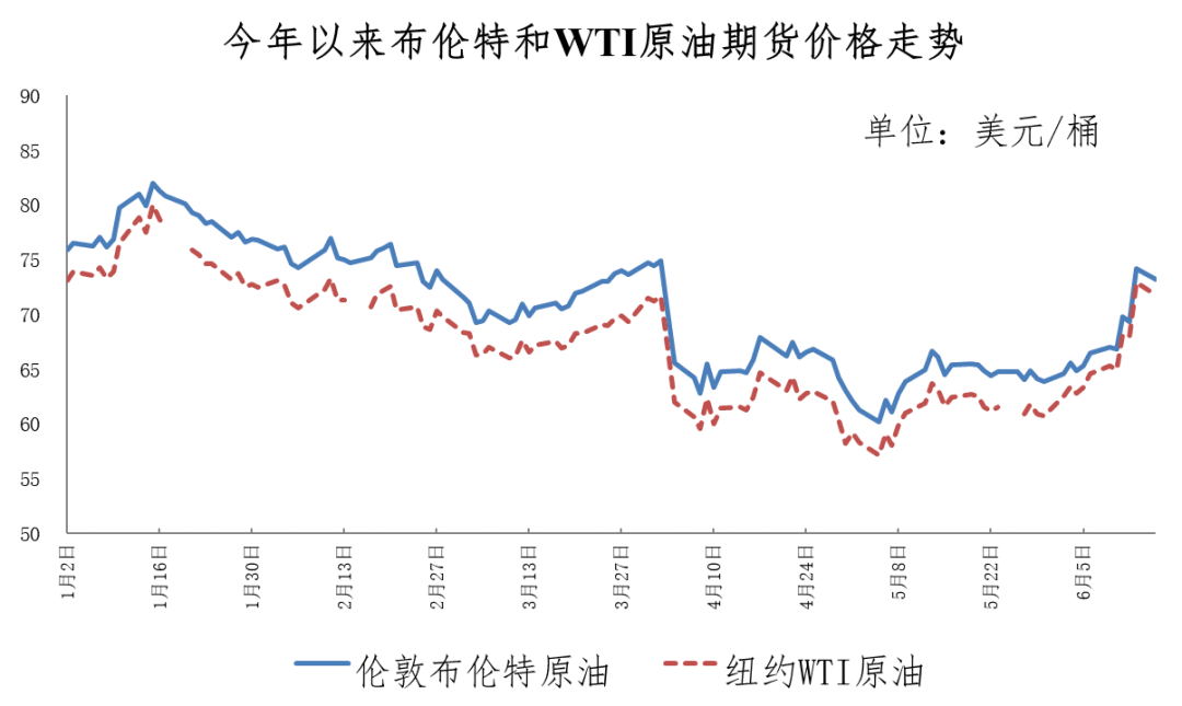 调价周期内,地缘政治风险上升主导国际油价震荡上行。一是以色列和伊朗互相袭击,中东地缘政治局势升温。6月13日以来,以色列、伊朗冲突持续,原定于15日举行的美伊第六轮核谈判也已取消,中东地缘政治局势急剧升温。二是欧盟提议下调俄油限价标准,加大对俄能源制裁。欧盟委员会拟在对俄新一轮制裁中,将俄油限价从每桶60美元下调至45美元,限价下调将对俄罗斯原油出口造成较大不利影响,进而减少全球原油供应。三是美国原油库存和供应数据呈下滑态势,也为油价提供支撑。截至6月6日当周,美国商业原油库存连续三周下降至4.32亿桶;截至6月13日当周,美国油气钻机数连续七周下降至555座,意味着后期原油产量将趋于下降。